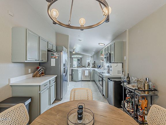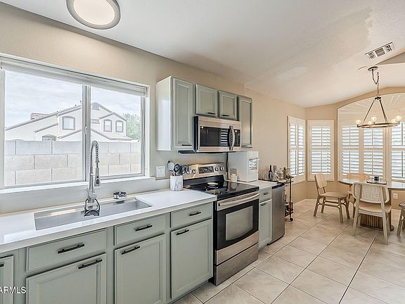 Recently updated! New roof 2023! Mountain views! Fantastic single level home in great Phoenix location. Beautiful desert landscape and backyard turf on a corner North/South lot. 3 bedrooms, 2 bathrooms, and 2 car garage. Very open floorplan from the front of the home to the back with Cathedral ceilings. Owners recently updated the kitchen and both bathrooms with today's modern look. Gorgeous kitchen with stainless steel appliances, quartz counters, plenty of room for cooking and entertaining, and an upfront eat-in dining area with bay wall. Bathrooms have new vanities, sinks, and flooring. When in the backyard enjoy your covered paver patio and private lot. New water heater 2025. Fridge, front load washer and dryer convey with home.