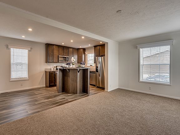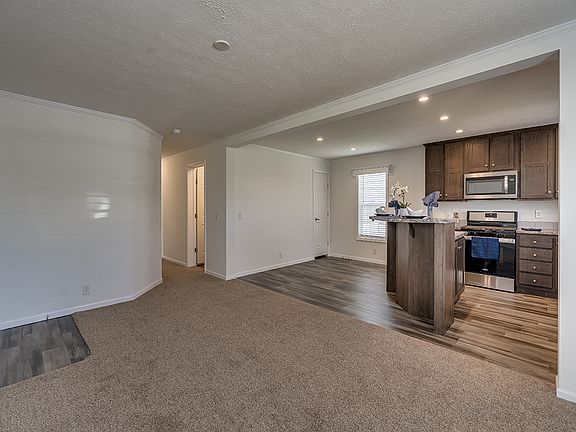 Stepping into the home you enter into an open concept living, dining and kitchen area. This home has a utility room / laundry room with a back door. Continuing on you enter into a nice size master bedroom with a walk -in - closet and an attached master bathroom. Right of the living room is two bedrooms with a bathroom in the middle. The ceiling height is 8 ft. adding to the open airy feel of the home.This 2021 Home features stainless steel and trim adding an updated look to the appliances. The cabinets are the Creston Oak Cabinets a hard wood product designed to stand up to everyday use of a busy family.