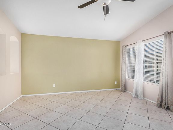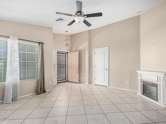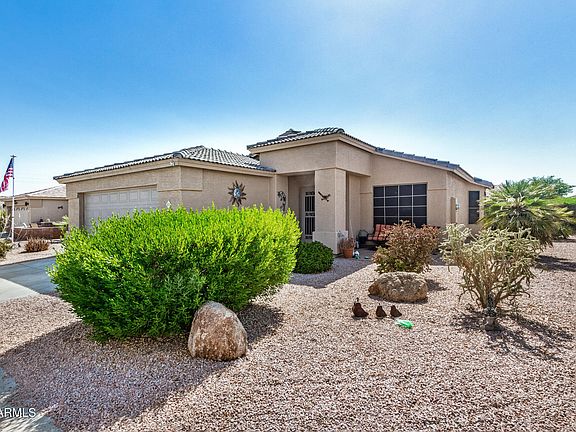 Take a look at this 3BR residence in the gated Meridian Manor! This charming home showcases a desert landscape, a 2 car garage, and a cozy porch. The interior boasts a traditional split floor plan with a formal living room & a spacious great room, allowing privacy between spaces while promoting a sense of openness with arches in the wall that let in light & air. The kitchen features wood cabinets, ample counters, and white appliances. The owner's suite is bathed in natural light thanks to its bay windows; the ensuite bathroom has an oversized vanity sink. Out the back, you'll find a paver patio perfect for relaxing and unwinding. This 55+ gated active community offers clubhouse, tennis court, spa, pool, pickleball court, and much more. Don't miss this amazing deal!