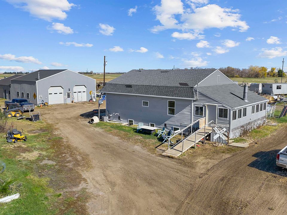 Welcome to a bright, spacious 5-bedroom, 2-bath home offering over 2,400 square feet of comfortable living. This home has a large insulated front porch. The main level features an inviting living room, a dining area next to the open and functional kitchen. The main floor bedroom provides a restful retreat with an en-suite bathroom that includes a jet tub. There is a pantry with room for a freezer just off the kitchen. Downstairs, four additional bedrooms deliver flexibility for family, guests, or a dedicated home office and hobby spaces. Practical highlights include a downstairs laundry room and durable flooring throughout the home. Outside, there is an 80x40 shop with a 4.5-ton 2-post hoist perfect for doing your own repairs or starting your own business. The home is situated on 11 acres with maturing choke cherry, juneberry, plumb, apricot, apple, and pear trees. Raspberries, blue berries, asparagus, and rhubarb also return every year right in the yard. A barn, chicken coop and other out buildings are also present and there is an additional 13 acres across the road to the SE.