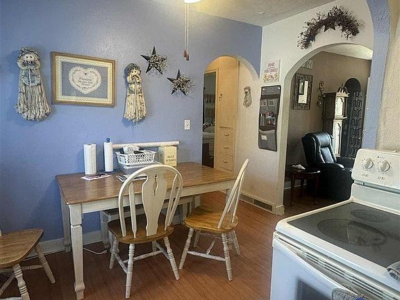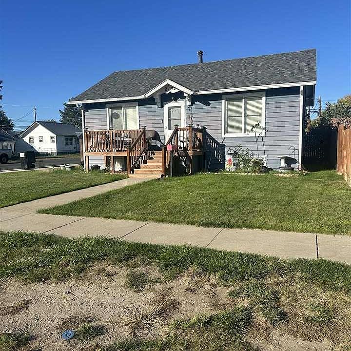 Fenced in backyardCorner propertyDining areaFront porch deckWood floors