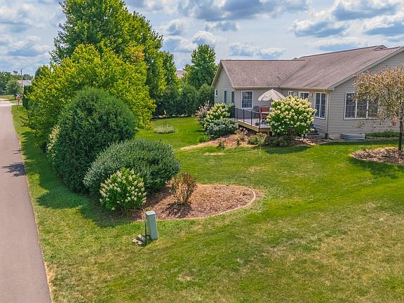 The Ranch you have been waiting for, with front porch, located in North Fields! Over 1800 Sq Ft on main floor and a finished basement!! 4 bedrooms and 3 full baths. Laundry on main level. Oversized 2 car garage with an abundance of shelving. Open floor plan between living, dining and kitchen. Bonus room off kitchen could be used for formal dining or sunroom. Living room with gas fireplace. Kitchen with tiled floors, large island, and pantry space! Spacious primary suite, with a walk-in shower, whirlpool tub and double sinks. Large walk-in closet, with dual entrance from bedroom/bathroom! Bedroom 2 with walk in closet. Bedroom 3 with French doors, currently used as office. An abundance of privacy in backyard with trees and landscaping, and backs to the trail! Enjoy peaceful evenings on the trex deck with beautiful flowers/landscaping. Finished basement has daylight windows in open, spacious family room. Basement also includes 4th bedroom & full bathroom with tiled walk in shower. Great storage room with more shelving!!! Generac generator comes with the house. Geo-thermal too! All kitchen appliances & washer/dryer will remain.