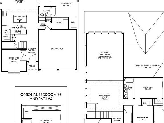 Home office with French doors and 11-foot ceiling set at two-story entry. Open kitchen features deep walk-in pantry and generous island with built-in seating space. Dining area opens to two-story family room with wall of windows. Primary suite includes bedroom with 10-foot tray ceiling. Double doors lead to primary bath with dual vanity, garden tub, separate glass-enclosed shower and large walk-in closet. An additional bedroom is downstairs. Secondary bedrooms and game room with 10-foot tray ceiling are upstairs. Covered backyard patio. Mud room off two-car garage.