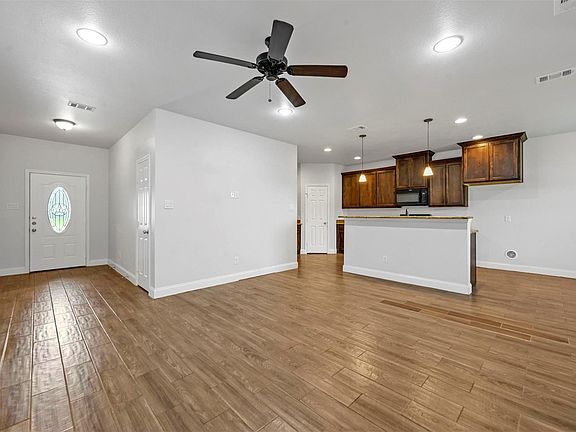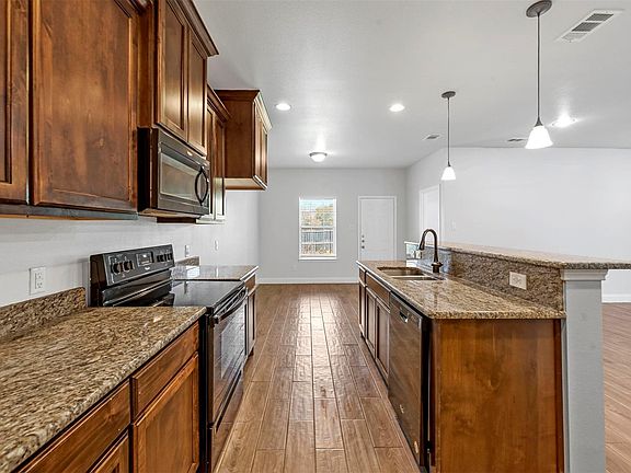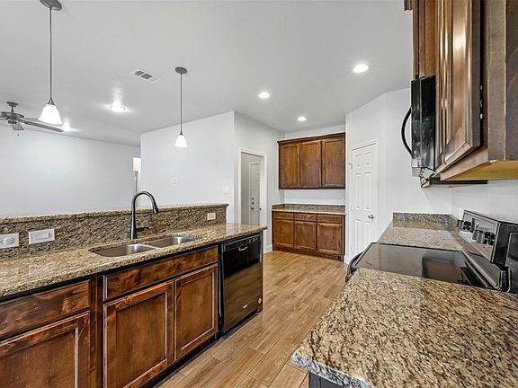 The open living spaces feature elegant tile wood flooring that provides both durability and charm. The kitchen is designed to impress, with sleek black appliances, granite countertops, and ample cabinetryperfect for meal prep, entertaining, or enjoying a cozy family dinner. Both bathrooms also showcase granite countertops, tying the home's design together with a polished, cohesive look.