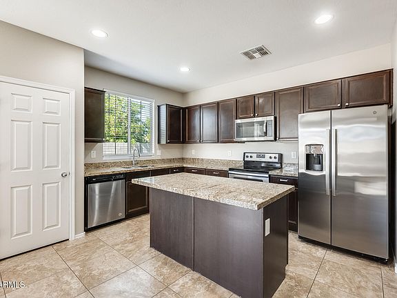 Welcome to this beautiful 3-bedroom, 2-bath home with a den offering a generous 1,870 sq. ft. of living space and an open great room floor plan perfect for modern living. The kitchen is a chef's delight with an island, pantry, granite countertops, rich cabinetry, and breakfast bar. Enjoy generously sized bedrooms, a two-car garage with overhead storage, and an entertainer's backyard ideal for gatherings or quiet relaxation. Nestled in a pet-friendly community, this home is meticulously cared for and conveniently located near parks, schools, Fry's Food & Drug, Coldwater Golf Club, Target, Estrella Mountain Regional Park, and Phoenix Raceway. A perfect blend of comfort, convenience, and pride of ownership!