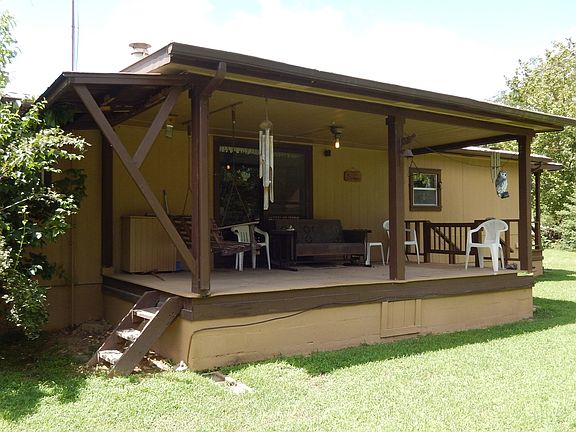 This manufactured home on a permanent foundation sits in a beautiful valley with amazing views and ample wildlife. The home has 7 foot ceilings, 3 bedrooms, 2 bathrooms, storage garage, storage building and chicken coop! There are three porches, all with fantastic views. The property is flanked on the left and the back by a beautiful creek. The home has an open floor plan living and dining area. It is heated by a wood burning stove and cooled by window units. This home is extremely well insulated and stays comfortable even on summer days. You will have an acre of amazing gardens and foliage. Fruit trees, flowering dogwoods, rose of sharon, peonies and irises! Apple and Pear trees are on the property. Property also has a storm shelter behind home. You really have to see this home and property to appreciate it! Mineral rights do not convey. Deer and Turkey are always around this land. The home and 5 acres next door are also listed and the properties are connected by a bridge and foot path through the meadow. So, buy both and bring a friend!