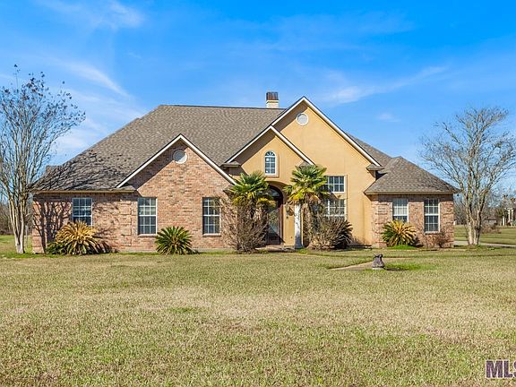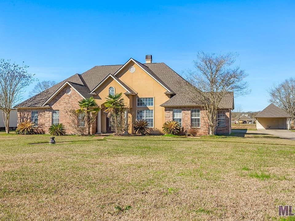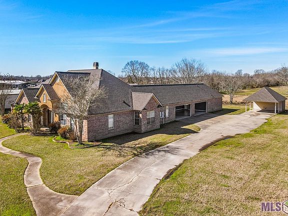 Spacious country home features guest-quarters with kitchenette and full bathroom, 4 car garage side entrance, detached 2 car carport with storage. New roof shingles on residence and detached carport. Interior features office, formal dining, master bedroom suite with kitchenette. Custom cabinets with slab granite in kitchen. Custom built in entertainment center in living room with wood burning fireplace. Tray ceilings in living room and formal dinning. Recessed lighting and speakers throughout. Flood zone x.