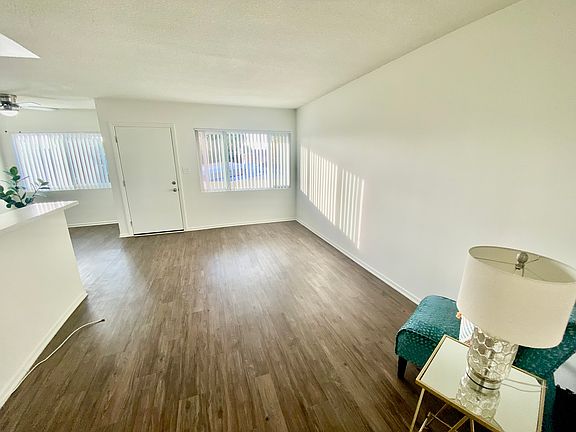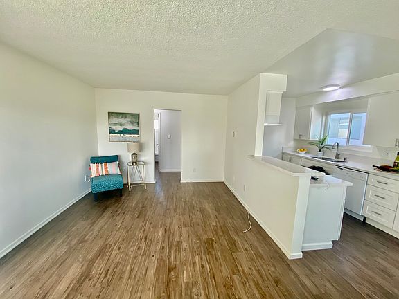 This 1 bedroom/1 bath is an upstairs unit in the back of a professionally maintained 4-plex. It has a newly remodeled kitchen with quartz countertops, stainless-steel kitchen sink, lower cabinetry, oven/stove range, dishwasher, garbage disposal, and a high countertop, which is a great place for informal dining. It's been freshly painted throughout. Wood laminate flooring is in the entire unit, except for the bathroom, which has tile. Lots of a natural light, double-pane windows, and storage. Bathtub was recently reglazed. Ceiling fans in dining area and bedroom. Laundry onsite. Shared garage parking with overhead storage. Don't forget to ask about our move-in special. Year lease. Owner pays for water, trash, and gardener.