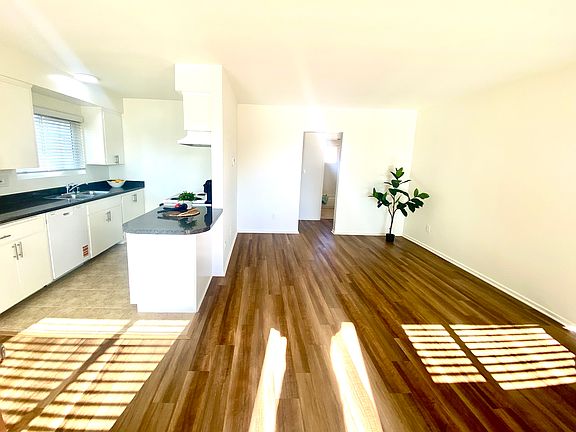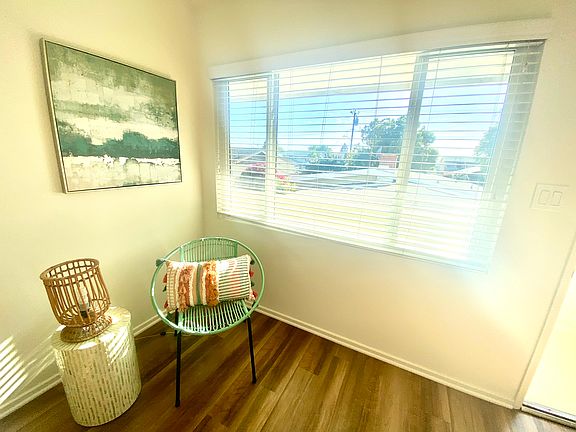 This 1 bd/1 ba is an upstairs unit in the back of a 4-plex. No unit below. It has been freshly painted with "wood" laminate flooring throughout tile in kitchen and bathroom. Kitchen has new dishwasher, cabinets freshly painted, stainless-steel sink, and dining area. Lots of natural light and storage. Double-pane windows along with ceiling fans throughout the apartment. One garage parking spot. Laundry onsite. NO PETS. Shown by appointment only. Year lease. Owner pays for water, trash, and gardener. Tenant pays for electricity and cable/Internet. No gas.