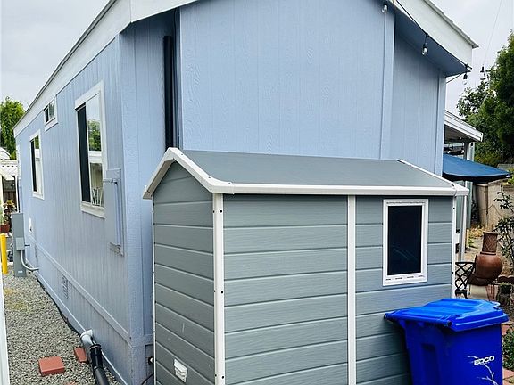This beautiful mobile home is located in a Senior Mobile Home park hidden in a safe and quiet neighborhood. Its a one bedroom, one bath with large closet, storage and high ceilings throughout. It has beautiful natural sunlight that shines through the kitchen skylight and windows. Large carport that can accommodate two vehicles. Small storage shed in back yard. Community laundry room on site This unit is being sold as is with no warranties or guarantees.