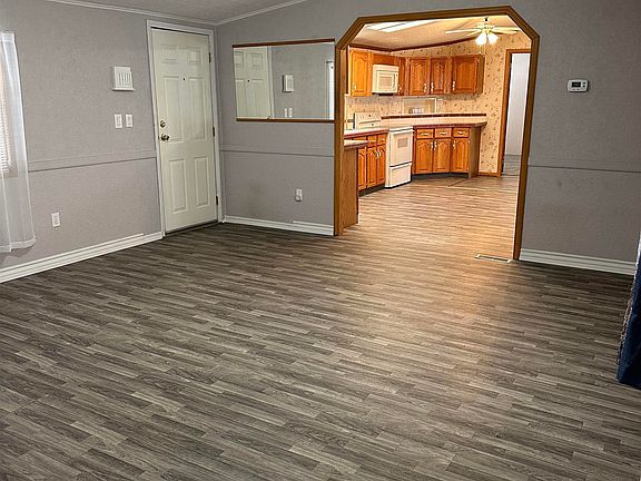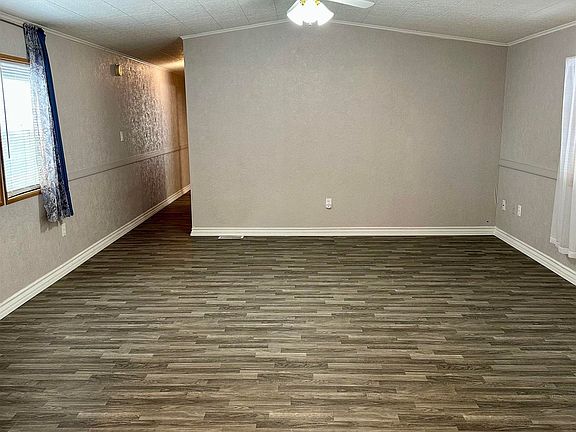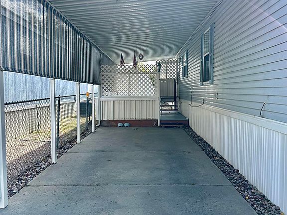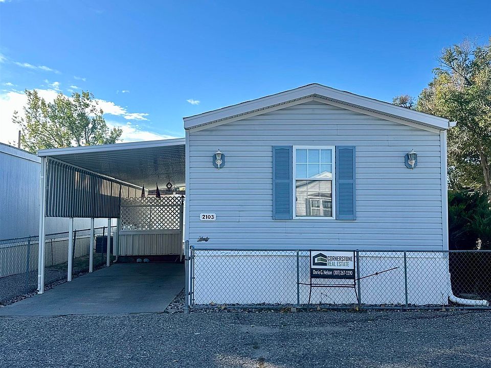 Open floor plan with 3 bedrooms and 2 bathrooms, featuring a wide hallway and a large primary bedroom with two closets and extra storage. Newer updates include interior paint, flooring, and a high-efficiency furnace with new ductwork. Enjoy a fenced yard, corner lot, private covered deck, and dedicated parking. Kitchen appliances, washer, and dryer are included. The home and shed are located on a rented lot for $675/month, which includes water, sewer, and trash. This 55+ community offers seller financing options with a down payment. Call Dorie G. Nelson with Cornerstone Real Estate at 307-267-1190 for more details!