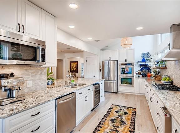 Updated family home w/3 bed & 2 bath in main house, new French oak wood floors, new paint, new Hardi siding, nice home office, living room and dining room. Entertaining kitchen w/KitchenAid appliances, double convection oven, 36" gas cooktop, built-in ice maker, wine fridge and rack and huge island open to large dining and big slate covered porch. 1/1 guest house/in-law/nanny suite, w/full kitchen, large closet and tile shower. Media room w/full bath, 2nd laundry, built-in ice maker and custom murphy bed.