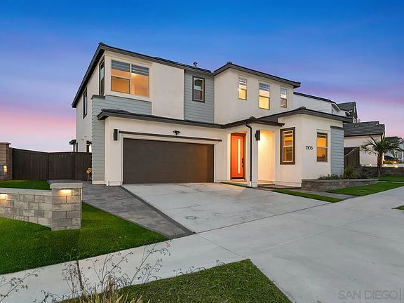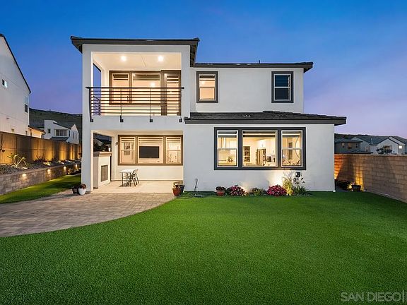 Discover a rare opportunity to own this newly built modern home, beautifully situated on a desirable corner lot in the picturesque hillsides of Otay Ranch. This residence features a gourmet kitchen with elegant quartz countertops, a large island, and top-of-the-line appliances. The primary suite boasts a private balcony and a spa soaking tub. Fully landscaped with turf, pavers, and ambient lighting, plus a covered patio & outdoor fireplace. Solar panels and seamless gutters lead to a unique blend of sustainability & luxury.