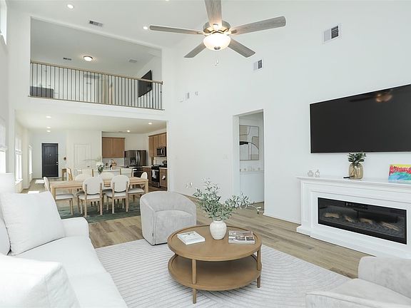 Custom built 4-bedroom, 3.5-bath home designed for comfort and style. Wood-look tile floors flow throughout with no carpet, paired with $10k in premium custom blinds and soaring ceilings that create a bright, modern feel. The open-concept kitchen is the centerpiece of the home, featuring a large island, sleek finishes, and plenty of space for cooking and entertaining. Enjoy privacy outdoors with an extended covered patio and no back neighbors, perfect for relaxing or hosting gatherings. Additional features include epoxy-coated garage floors and thoughtful upgrades that add function and value. Move-in ready and built to impress—schedule your private tour today!