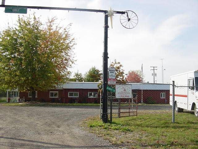 Lovely 3.76 acres with private road, home with 2 bedrooms, living room, kitchen with eating area, covered patio, pond stocked with fish, additional building behind home, zoned heavy industrial.