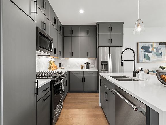 Attached garageFront yardNatural oak hardwood flooringLarge one-car garageModern luxury finishesLarge quartz waterfall islandFenced backyard