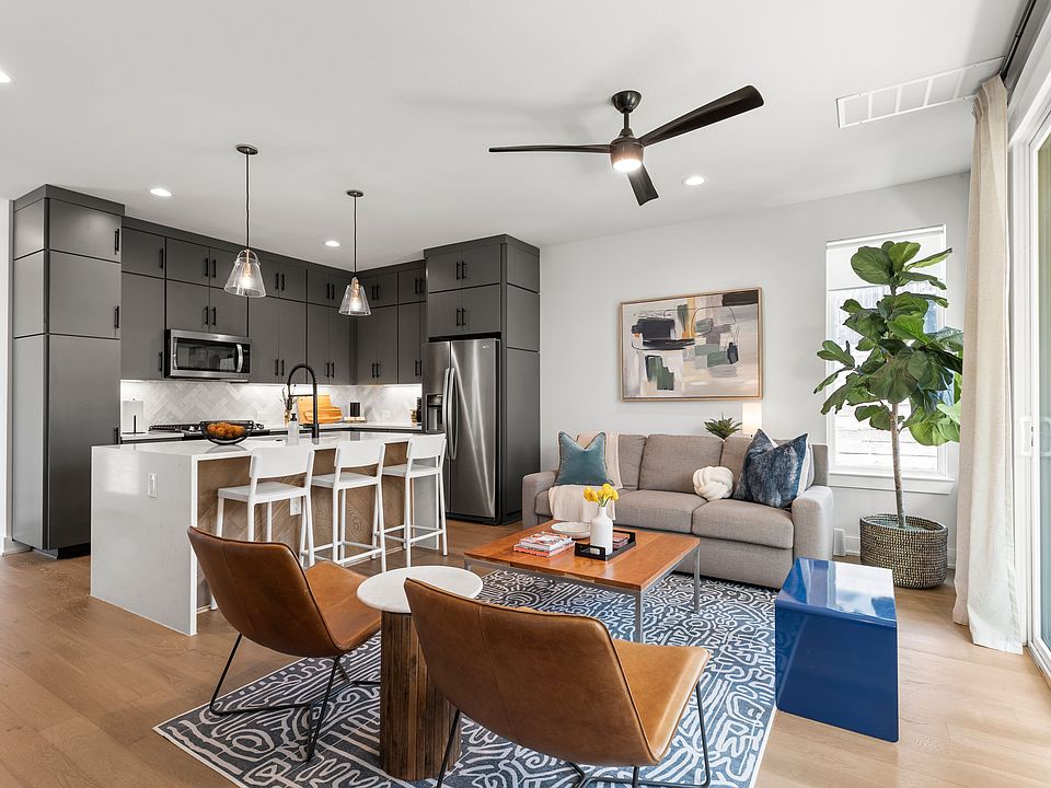 - Open concept living/dining area with a large quartz waterfall island that makes for a great dining area.