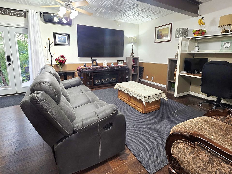 All Bills Paid Large Furnished Day Light Suite with Master Bedroom. The space has a large living area, kitchenette, king bed, walk-in closet, and gym equipment.