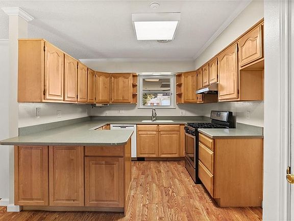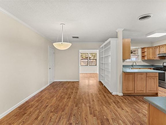 The open kitchen and dining area includes built-in shelving for displaying décor or servingware, plus a versatile built-in desk with upper shelves that can double as a bar or serving station. No carpet throughout—Pergo wood flooring runs through most of the home for easy maintenance.
