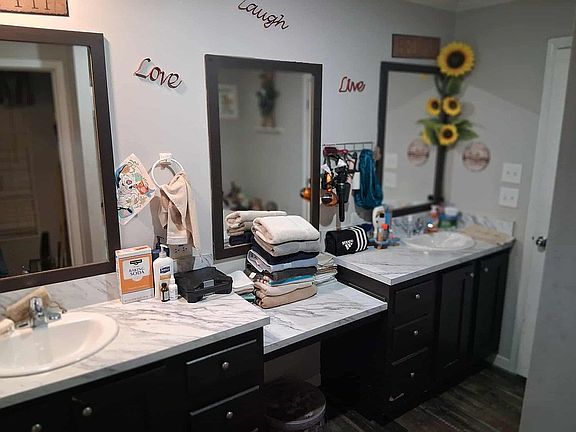 3 bedroom 2 full bathrooms . Master bedroom has sliding doors that leads out on the deck and Swimming pool . with river rock all the way to the pool and the fire pit then there a walk way to drive way. 2¹/² car garage with a 2 post car lift a pavilion way out in the yard .a small barn a car port . 2 storage sheds. And a large privacy fenced in area so you can store all the extra cars trucks rvs jetski or anything you like 3.33 acres . Nice view of cows , nice area.