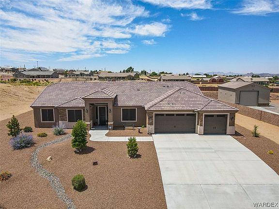 A beautiful custom home in Hualapai Foothills! 3020 sf of pure elegance. Large 4 bed, 3 bath home fits those larger family sizes. The living area features a gas fireplace, adding warmth and ambiance. The master bedroom is spacious and includes a walk-in shower, a soaking tub, and a separate water closet. There is a convenient man door in the master bedroom that provides direct access to the outside patio. The kitchen is equipped with custom pull-outs and self-closing drawers, as well as custom stain and extra lazy Susan cabinets. A true chef's kitchen. There is a seating area at the bar that can accommodate 6-8 people. The home features an extra-large pantry for ample storage. The kitchen is equipped with double ovens, allowing for convenient cooking and baking. The kitchen appliances have a sleek black stainless steel finish. Having a three car garage gives you room for toys and extra storage. The property offers scenic mountain views. With having 1.45 acres There is extra space on the property to ensure privacy. The property provides unlimited space to add a pool if desired. The possibilities are endless with the potential to add an outdoor fireplace for additional comfort and enjoyment, a pool, casita, RV Garages/Shops. How convenient to have the possibility of storing everything on one property. The home features nice landscaping, enhancing its curb appeal. A large covered patio allows for outdoor relaxation and entertainment. Enjoy an outdoor firepit. The front of the home showcases custom rock work, adding to its unique aesthetic. Overall, this custom home offers a range of desirable features and amenities, including spacious bedrooms, luxurious bathrooms, a well-equipped kitchen, beautiful mountain views, and the potential for outdoor additions like a pool or outdoor fireplace. Having a home wired for solar installation is a significant advantage, as it allows for easy integration of solar panels and renewable energy systems. With the wiring already in place, adding solar power to the property becomes more convenient and cost-effective. Solar energy can help reduce electricity costs, decrease reliance on traditional energy sources, and contribute to a more sustainable lifestyle. It's an excellent feature to have in a custom home, providing the opportunity to harness clean and renewable energy.