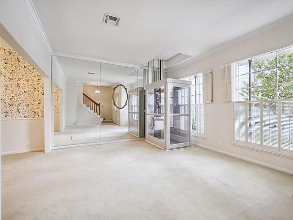 Den with fireplacePrivate patioGlass-enclosed elevatorLarge covered balconyBrick-lined porchRecently updated primary bathTwo-car garage