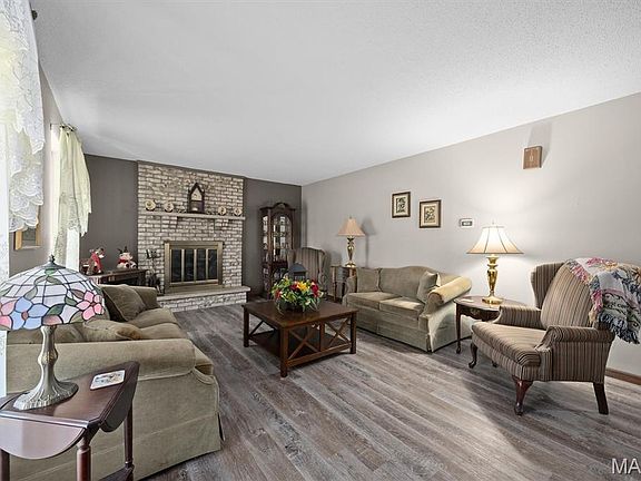 Step into this lovely residence and be greeted by a large living room featuring a classic brick, wood-burning fireplace—perfect for cozy evenings. The home flows seamlessly into an eat-in kitchen with rich wood cabinetry and stainless steel appliances, ideal for everyday meals and entertaining.