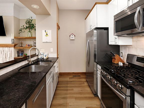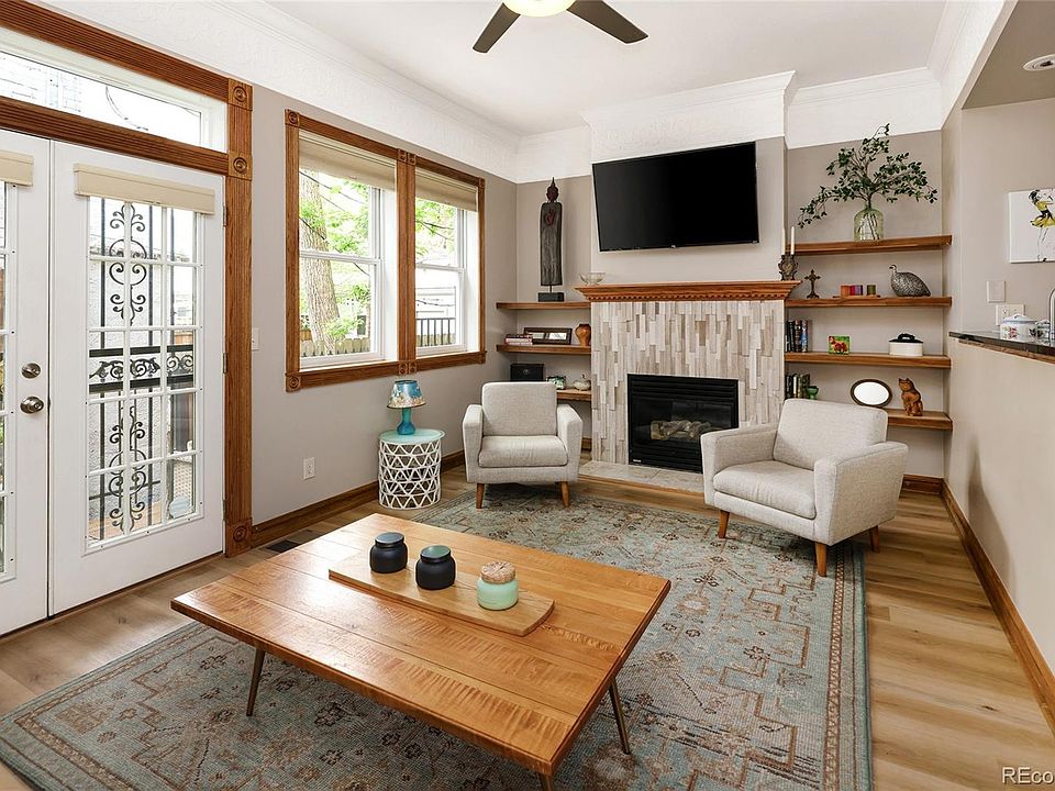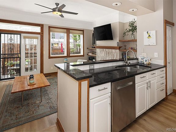 This thoughtfully constructed home sits in a 4-plex and reflects the architecture of the enchanting San Rafael historic neighborhood. It was built in 2000, and features 2 stories plus a finished basement. It's tucked off the street, offering the quintessential oasis in the City. Once inside, the main floor dining room easily doubles as a workspace, the laundry closet accommodates a full-size washer and dryer, and you'll find a 1/4 bath with new tile. The kitchen boasts a new backsplash and leads into the sunken family area, complete with a gas fireplace flanked by built-in shelves. You can step out onto the patio or upstairs to the bedrooms from the main floor. Once upstairs, the primary has a walk-in closet, a Juliette balcony, and a 3/4 bath; the second spacious bedroom is perpendicular to the first and next to a full bath. Stepping downstairs from the main floor, perfect for guests or roommates, you'll find a large bedroom or second family area with an egress window, closet, 3/4 bath, and huge crawl space for storage. This incredible home has updated flooring on the main and upper levels, a new backsplash in the kitchen, and new tile in two bathrooms. You'll get all of this within a vibrant, pet-friendly (a fence conveniently surrounds the 4-plex). Additionally, you can walk to the City Park Farmer's Market during spring/summer hours and check out neighborhood shops and restaurants like Pho +, Dew Drop Inn, Rosenberg's, Patagonia, Death and Company, Work & Class, and more. Every direction you turn, there are fantastic spots to eat, hang out, shop, and enjoy the eclectic City of Denver!