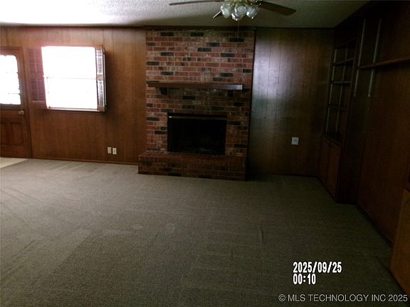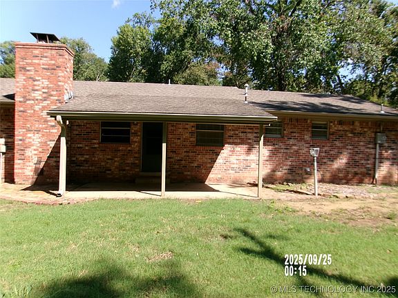 Ranch style brick home, formal living- dining Combo, Den with fireplace and built-ins, Gallery style kitchen has dishwasher, disposal, range with eating space, large bedroom with private bath, 2 nice sized bedrooms, full hall bath, 1/2 bath off kitchen area, covered patio, & a large fenced back yard, faux blinds at windows, central heat & air, celling fans.