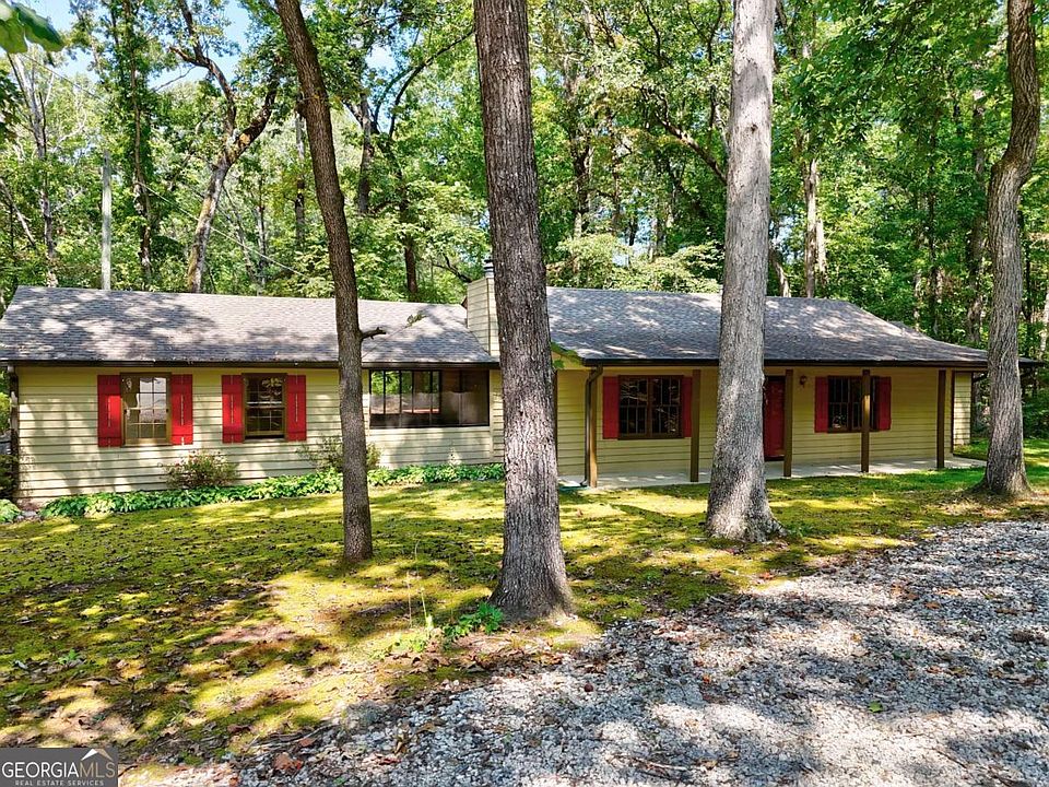 Spacious Ranch Retreat on a Full Acre - No HOA and Room to Breathe. Tucked away on a beautifully wooded one-acre lot, this updated ranch offers privacy and freedom with no HOA and no restrictive covenants. A long gravel drive leads to a home that feels like a hidden getaway, yet it's close to shopping, dining, and major highways. Step inside to a freshly renovated interior featuring new luxury vinyl plank flooring, granite countertops, and fresh interior paint. The vaulted family room highlights wood ceiling beams and a painted brick fireplace with a custom wood accent, creating a warm and inviting gathering space. The primary suite includes a barn-style sliding door leading to the private bath, giving the room a modern rustic touch. A screened-in breezeway porch connects the carport and kitchen-ideal for relaxing or hosting while enjoying the peaceful wooded views. The expansive back deck offers even more space for entertaining or simply taking in the tranquil surroundings. For hobbies, storage, or a small business, you'll appreciate the separate workshop/outbuilding with its own garage door and covered porch. Clean, move-in ready, and ultra-private, this property delivers the ideal mix of convenience and seclusion-your own slice of country living right in the heart of town.