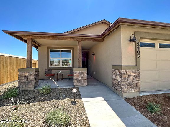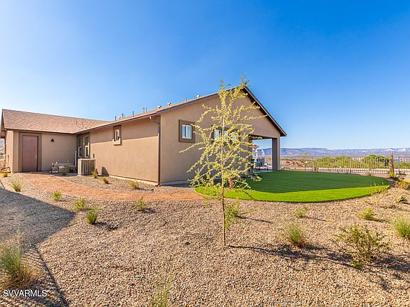 Rare opportunity to own a MODEL in the new Miramonte Homes' Subdivision in Mesquite Hills w a long-term lease back! Lovely 1571 plan is loaded with upgrades. 42'' Maple cabinets. Gorgeous 24 x48 Tile throughout. Bluzonite Granite Kitchen Countertops & Island. Built-in stainless wall oven with microwave & built-in gas cooktop. Primary bedroom has slider to the extended back patio & large, custom tile shower. Zero energy home includes a tankless water heater, plus a conduit in the attic for future solar panels. Huge 3 car garage has 2' garage extension, epoxy floor & is fully insulated w climate control mini split for both heating & cooling. Backyard artificial turf landscape w amazing views of Sedona. Front yard views of Mingus Mt are spectacular too. AWESOME!