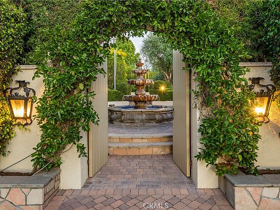 French limestone floors, hand-carved doors and vaulted ceilings are just a few of the amenities. From the graceful living room with sweeping views to the stylish kitchen with center island, adjacent breakfast room and cozy family room, the home was beautifully designed to promote an indoor / outdoor lifestyle. French doors provide access to a secluded lap pool on one side of the home and manicured gardens, expansive patios and a bubbling fountain on the other. Numerous citrus trees, a Pétanque court and large grassy play yards accentuate the outdoor amenities. The spacious bedrooms include an oversized primary suite with a fireplace and luxurious bathroom. The handsome office has hardwood floors and the formal dining room is perfectly positioned. The attached, 2-car garage provides direct access to the house and as a bonus, there’s covered parking for two more cars. Some of the additional features include 3 masonry fireplaces, air conditioning, a wine cellar and much more. This property must be seen to be appreciated; very few homes exude such class and style.