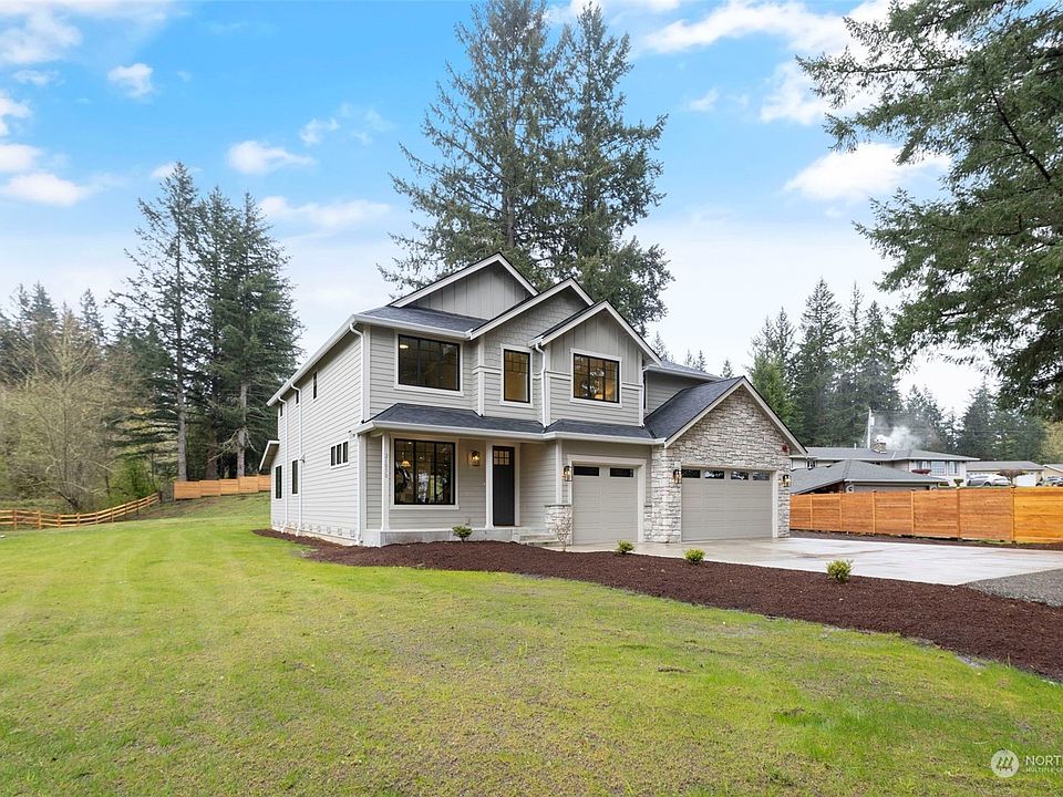Best new construction value in Hobart on an acre and located in the Tahoma School District! Filled with designer upgrades including fixtures, lighting, built-ins, and appliances. Efficient heat pump/AC. The gourmet kitchen w/butler pantry has custom cabinets and a 10' waterfall quartzite island. 5th bedroom on the main floor is perfect as an office or primary/guest suite w/hall bath. Primary suite upstairs w/large walk-in closet and ensuite 5-piece bath w/heated floors, dual vanity and a large soaking tub. Covered outdoor patio with gas FP. Huge 3-car garage with EV charging available. Finished detached heated garage offers ample space for home gym, shop, storing your boat or RV - Total of 1,273 sq ft. Great access to I-405, SR-18, SR-167.