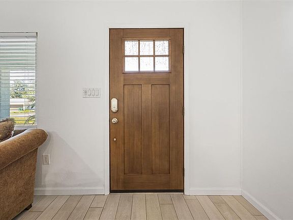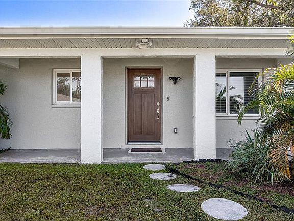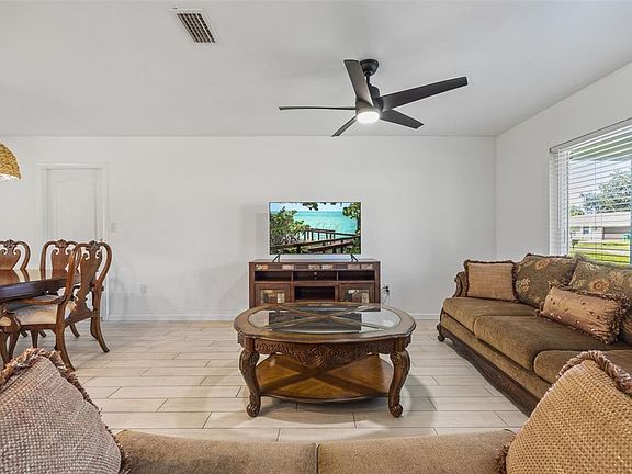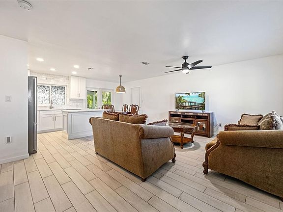 Beautifully updated 2 bedroom, 2 bathroom home with extensive modern upgrades throughout. Interior features include fresh paint, solid wood kitchen and bath cabinetry with stone countertops, and ceramic wood-look tile flooring in every room. The kitchen offers a spacious standalone island with additional storage and counter space. All appliances (2022) are included: glass-top range, microwave, refrigerator, dishwasher, washer and dryer. Both bathrooms have been completely remodeled with tiled showers, new vanities and toilets. Major systems have been updated: waterlines re-piped in 2021, water heater 2021, new roof in 2023, all new hurricane impact windows, new French door to the freshly painted screened lanai, and electrical system fully updated. Septic pumped in 2023. Home also includes a Ring security system and ceiling fans in each room. Exterior features a fully fenced backyard. Extra tile is available to finish the lanai. Located on a quiet street, conveniently close to shopping, dining, entertainment, and Gulf Coast beaches. Move-in ready—schedule your showing today.