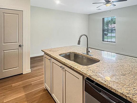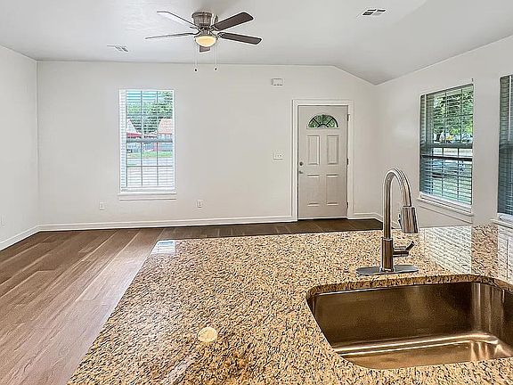The spacious living room is filled with natural light, creating a bright and inviting atmosphere. The open-concept kitchen features a center island with breakfast bar, sleek granite surfaces, a dedicated pantry, and stainless steel appliances, including a refrigerator, washer, and dryer provided upon lease signing.