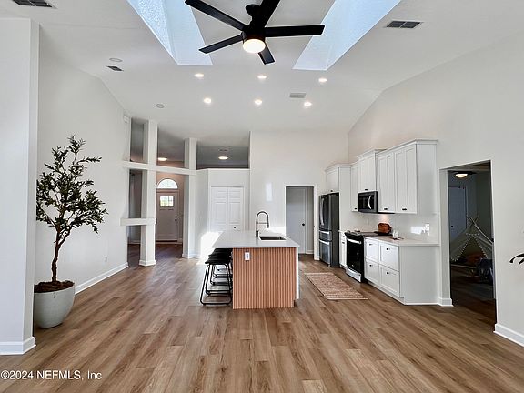 Elegant and cozy 4/2 home on 0.3 acres lot in desirable Kensington. Contemporary re-designed and completely remodeled in 2024. Feel quality as you walk in. The open floor plan offers vaulted ceilings. Freshly painted interior and exterior. New SS appliances. New quartz kitchen countertop, spacious kitchen island and white cabinets with soft closing and crown molding. New LVP luxury vinyl flooring throughout the house. New bathroom cabinets with quartz countertops. New fans & light fixtures. All new plumbing fixtures. 30 years Architecture Roof - 2014. HVAC - 2023. Custom shower glass enclosure in Master Bathroom. Newer WH -2018. Water softener- 2014.Full irrigation. Fully guttered. All new low E windows and sliding door. Fully fenced yard. Private irrigation well. Extended driveway. Community pool, basketball courts and children' playground. 10 mins to the Beaches and Mayo Clinic. 15 mins to UNF and St. Johns Town Center. Please see complete List of Upgrades under Documents tab.