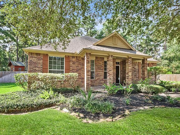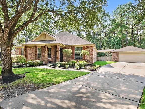 Tucked at the end of a quiet cul-de-sac, this one-story home offers privacy & charm with no back neighbors & peaceful greenbelt views. Step inside to find fresh updates, including a new 5-ton HVAC system installed May 2025, a split A/C & updated ceiling fan in the Primary Bedroom, & foundation repairs completed in 2022. The Kitchen shines with painted white cabinets, a stone backsplash, & updated hardware. A stacked stone fireplace with a white hearth adds a cozy focal point, while laminate & tile flooring throughout means no carpet to worry about! The floorplan includes 3 bedrooms plus a private Home Office with French doors. Outdoors, enjoy the covered patio & pergola, perfect for entertaining, along with a spacious backyard that offers plenty of room to play or relax. A detached two-car garage & extended driveway ensure ample parking space. The community offers great amenities, including a pool and parks. Convenient shopping, dining, & major highways like I-45 & 99 are all close by!