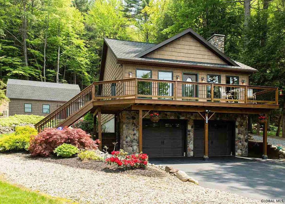 If you're looking for your perfect year round lakefront home, look no further! This 2009 Adirondack style home boasts many upgrades! The property has 87 feet of permitted Sacandaga Lake frontage! The main floor features open concept living with stone wood burning fireplace, dining area that comfortably fits a large table and a kitchen with a built in wet bar. Just off of the kitchen is spacious master bedroom with custom circle window allowing you to bring outside in. Downstairs is used as studio style guest quarters with a full bath, laundry and storage. The outdoor living is great with two decks and a patio surrounded by impressive stone walls, mature landscaping abounds. Plus there is a detached 2 story garage with spray foam insulation and heated and cooled for work/living space. The lake access is excellent - no steep banks to climb! Pontoon boat and furnishings available for sale.