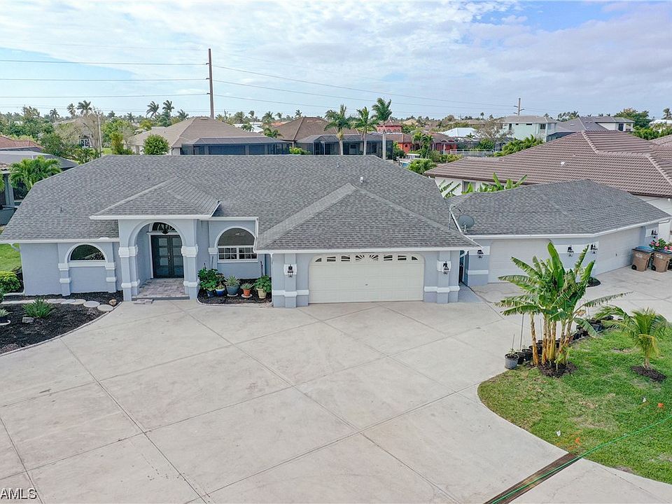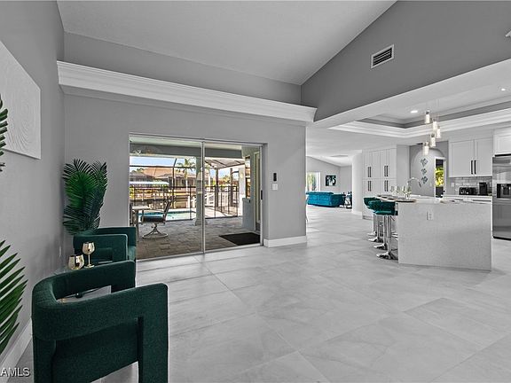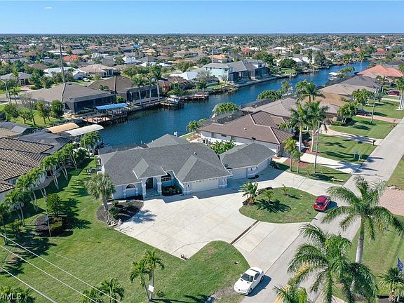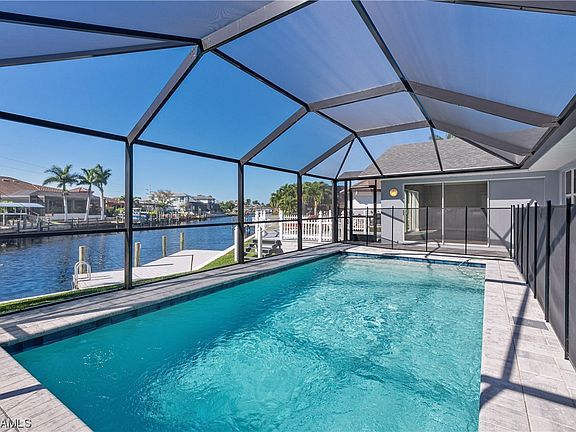 SW Cape Coral~Gulf Access Pool Home. Southern Rear Exposure. Located on a nearly half acre corner lot. This updated 3 bed, 2 bath pool home is a car collectors dream, featuring a 5 car garage! Ample parking inside and out with an expansive circular driveway. Must see to appreciate. Expand your outdoor living under the brand new pool with spacious lanai with an outdoor kitchen and onto the oversized sun deck and private dock. NEW BOAT LIFT. From the great-room, one can access the oversized sundeck. Owners en suite is updated with soaking tub and separate glass enclosed tile shower. Spacious walk-in closet. Soft-close kitchen cabinets and oversized quartz island with single sink basin are as appealing as they are versatile! To complete the look, a wall pantry, cooktop and wall oven add to the kitchen’s appeal. Laundry in residence. Enjoy the beautiful views from the kitchen and great room, pool or sundeck.