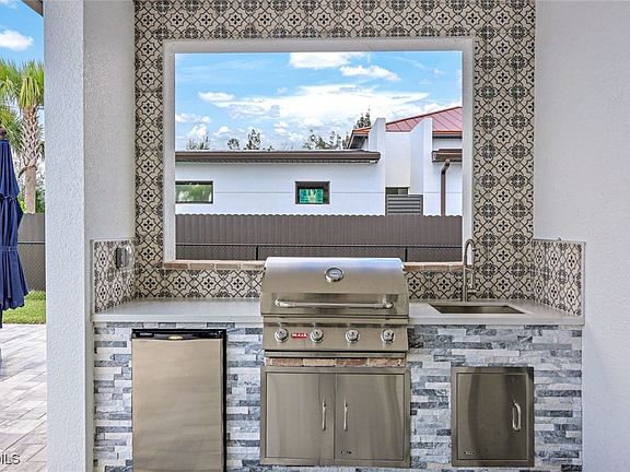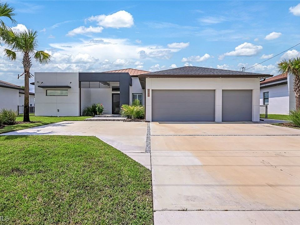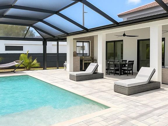 Southern Exposure, Newer Built Salt Water Pool Home! ASSUMABLE VA MORTGAGE AT 5.75% - Available to Veterans! Welcome to this stunning modern home in the up and coming and highly sought-after Pine Island Corridor. This exquisite residence features 3 spacious bedrooms and 2.5 well-appointed bathrooms, offering floating cabinets, quartz counters and high end fixtures. Pull into the oversized concrete driveway with a decorative transition, leading to a 3-car epoxy floor garage, plus additional parking pad. Inside, the home is designed with sophisticated touches such as straight stacked porcelain tile throughout, impressive 12 ft ceilings, and elegant brass Sputnik chandeliers, impact windows and doors throughout. The open space kitchen is a chef's dream, featuring a 12 ft quartz countertop island and backsplash, European-style cabinets with soft-close technology, 2 Whirlpool stainless steel ovens and a commercial grade hood vent. The living area includes a wine case feature wall with an art niche and an electric fireplace, creating a cozy and stylish atmosphere. One way solar tinted sliding glass doors lead to the oversized pool area, perfect for outdoor entertaining ensuring privacy as well as energy efficiency. Cool off in the electric heated crystal blue blue salt water pool with sun shelf surrounded by a fenced-in backyard beautifully landscaped with an assortment of pygmy dates, palm trees, flowers, and fruit trees. Additional outdoor amenities include oversized pavered sun pad, outdoor shower and a summer kitchen with a grill, refrigerator, and sink. Smart home features such as a Google entry, security system, along with LED lighting throughout, add to the modern conveniences of this home. Contemporary touches such as a decorative wine display, plantation shutters, remote controlled custom zebra blinds, built in custom closets and floating cabinets make this home is a perfect retreat for those who appreciate modern luxury and enjoy the Florida lifestyle. Head down to the Pine Island Corridor for a plethora of dining, shopping and entertainment options. City Water and Sewer in Place! You deserve to enjoy everything SWFL has to offer - beautiful weather year-round, world class fishing, golfing, kayaking, paddle boarding, tubing, jet ski or just relax in your very own tropical paradise! Call and schedule a private viewing today! NOT located in an HOA!
