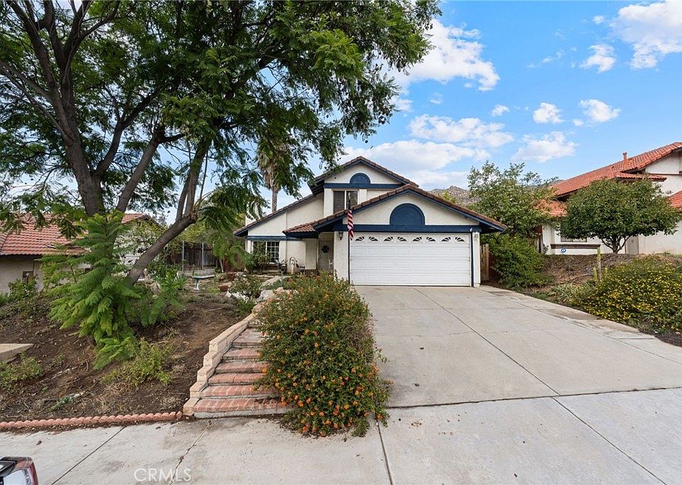 The front yard offers low-maintenance landscaping, and the property includes a two-car garage plus extra exterior storage space.