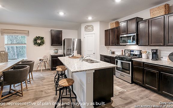 Modern design meets everyday livability in The Gaven floor plan located at Brookstone Creek in thriving San Antonio, TX! This spacious 1778 square foot, single-story home offers four bedrooms, two full bathrooms and a well-balanced layout perfect for a variety of lifestyles. From the moment you enter, a welcoming foyer sets the tone for the home's open and airy feel. The kitchen, dining area and living room are centrally located in an open-concept design, making it easy to entertain or enjoy everyday moments. The kitchen is both stylish and functional, showcasing stainless steel appliances, a gas cooking range, quartz countertops, flat panel cabinetry and a farmhouse-style sink. A spacious kitchen island and white subway tile backsplash add the finishing touches to this modern culinary space. The primary suite, tucked away at the rear of the home for privacy, offers a generous retreat complete with a tiled walk-in shower, dual vanity sinks and a walk-in closet. Your secondary bedrooms are thoughtfully designed to offer privacy and flexibility. Each room features quality carpet flooring, windows and ample closet space, making them ideal for children, guests or a home office. This home includes our HOME IS CONNECTED base package. Using one central hub that talks to all the devices in your home, you can control the lights, thermostat and locks, all from your cellular device. Enjoy outdoor living with a covered patio (per plan), full yard professional landscaping package and irrigation, ensuring that your home looks its best every single day. The Gaven floor plan offers thoughtful design, stylish finishes, and plenty of room to grow - right here in vibrant Brookstone Creek.
