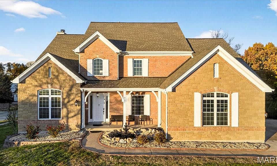 Step inside this luxurious 4,356 sq ft home nestled on a quiet cul-de-sac, welcomed by a stone front, side-entry 3-car garage and a peaceful pool. The airy layout unfolds with high ceilings, arched openings, wood floors and crown molding, guiding you into a warm family room featuring a cozy cast-stone fireplace accented by a custom stone wall. The kitchen is a true dream — custom 42" cabinets with crown, granite counters, walk-in pantry, stainless appliances, a spacious center island with downdraft cooktop and a separate California bar with seating. The oversized primary suite offers a serene escape with tray ceiling, large walk-in closet and a spa-like ensuite with soaking tub and glass shower. Main-level laundry and carpeted bedrooms add everyday comfort. The tall-pour walkout lower level extends living with a large rec room, added sleeping quarter/home gym, remodeled bath and a sunroom with a hot tub that stays. Step outside to your private retreat — a fenced, spacious yard, saltwater pool with fountain feature, and a deck overlooking the pool. Updates include new pool liner, motor, filter, outdoor lighting, stained deck and fresh interior paint. Located in the sought-after Rockwood School District and within walking distance to Lafayette High School, this home blends elegance, comfort and resort-style living.