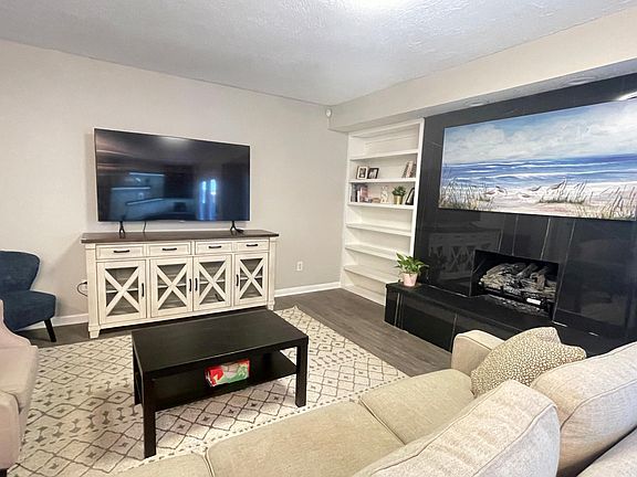 Large format tile fireplaceFull fenced yardNew queen mattressKing size bedModern kitchenExtendable islandCoffee bar