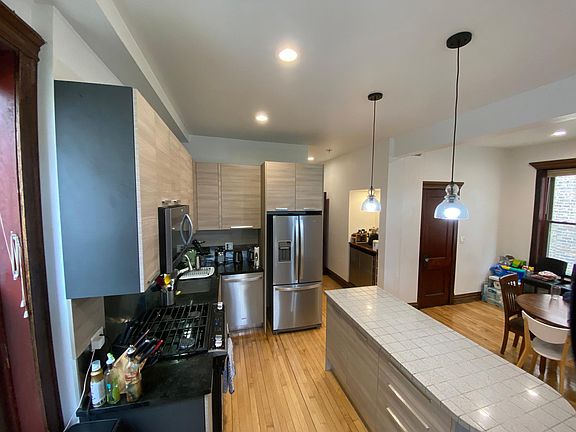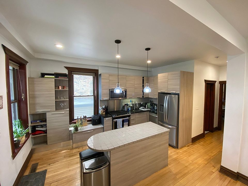 Logan square. Beautiful very large 4 bedroom, 3 bath duplex in a 2 flat gray stone. Full gut rehab while preserving the vintage charm Large Italian kitchen with island and family room. Made for entertaining Bright living and dining room with gorgeous wood arch and built in hutch Second living room with bar area in lower level Master bedroom with bathroom and walk in closet 3 more bedrooms with 2 full bath Laundry and dryer in the unit Plenty of closet spaces throughout the unit Large back porch and garden 2 parking spots (1 in garage, 1 outdoor) Air conditioning Close to blue line and the 606 trail Walk to restaurants, bars and all Logan has to offer Owner pays for water. Renter pays for gas and electricity. Non refundable Move-in fee: $500