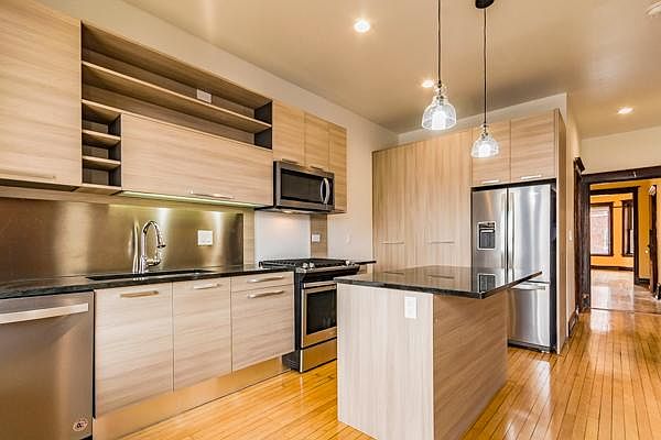 Logan square. Beautifully renovated large 3 bedroom in a 2 flat gray stone. It features: Large Italian kitchen with island Original features as hardwood floors, build in hutch Bright living and dining room 3 bedrooms 1 bathroom Laundry and dryer in the unit Large back porch and garden Air conditioning 1 garage parking spots Close to blue line and the 606 trail Walk to restaurants, bars and all Logan has to offer Renter pays for gas/electricity Move-in fee: $500