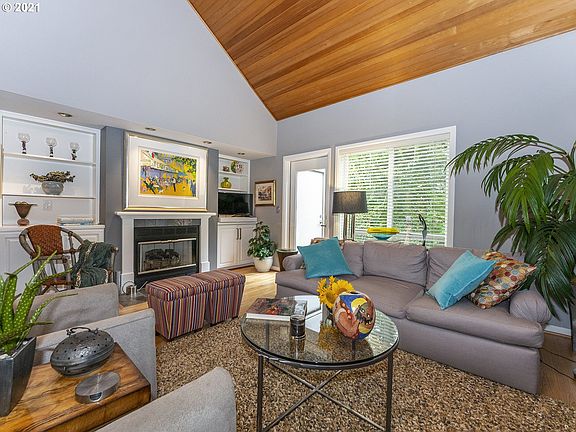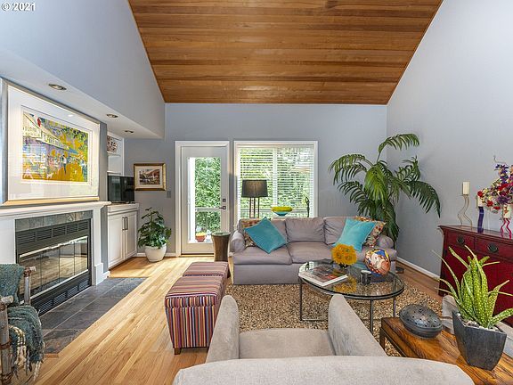 Beautifully updated end unit townhome in desirable Forest Heights. Soaring vaulted Hemlock ceilings, hardwood floors, gas fireplace with built-ins. Kitchen has lots of cabinets, pullout shelves, SS appls. Primary suite upstairs has vaulted ceiling, double sinks, soaking tub and 2nd bedroom with bath. Private peaceful deck backs to forested greenspace. Large tandem garage can hold two cars as well as having a storage. Quick stroll to the Village Center, walking trails, park & Trimet bus stop.