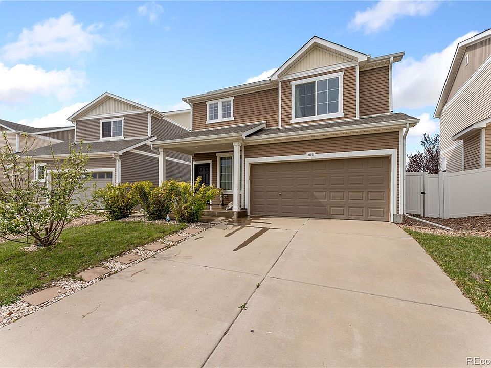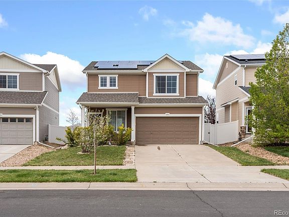 Delightful two-story home in Green Valley Ranch! A covered front porch welcomes you in. Step inside to discover an effortless floor plan designed for modern living. The main level features a formal dining area, seamlessly flowing into the backyard. The kitchen boasts stainless steel and black appliances, tile countertops, a convenient breakfast bar, and ample cabinet space for all your essentials. You'll find a convenient half bath and a main level laundry area, adding to the home's functionality and ease of living. Venture upstairs to discover the spacious primary suite, complete with a generous walk-in closet and a lovely five-piece ensuite bathroom. Two additional bedrooms, one with a walk-in closet, and another full bathroom provide ample space for family and guests. Outside, the large fully fenced backyard offers privacy with no neighbors behind. Recent updates include added central AC and a new water heater installed in 2021. Located in a thriving area with quick access to DIA, dining options, parks, and more, this home truly offers the best of suburban living. Don't miss your chance to make this yours!