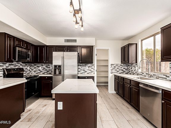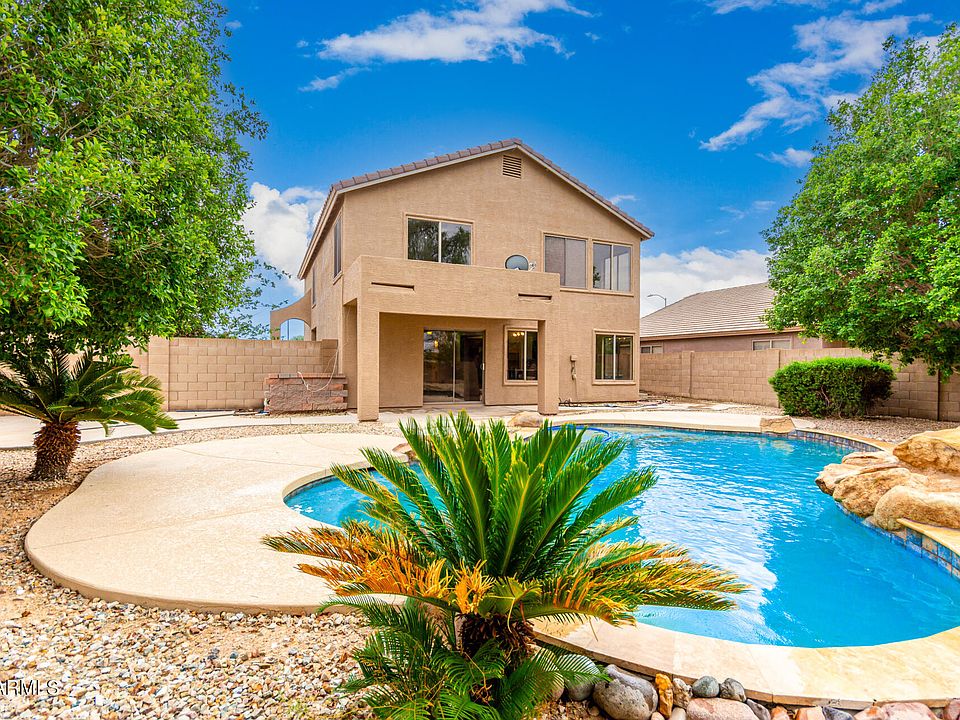 Embrace the beauty of this wonderful 3-bedroom home in the lovely Community of Sierra Verde! Discover an impressive open floor plan that welcomes you with rich wood-look tile flooring, tons of natural light, and fresh neutral paint throughout. Upgraded kitchen displays a walk-in pantry, track lighting, abundant cabinetry, mosaic tile backsplash, stainless steel appliances, quartz counters, and a center island. Retreat to the large primary bedroom, offering double door entry, a sunny bayed window sitting area, an ensuite with dual sinks, a make-up desk, and a walk-in closet. Highlights include a HUGE loft and a bonus room ideal for an entertainment area or office. Spacious backyard features a covered patio, mature shade trees, and a refreshing pool with a rock waterfall. Act swiftly!