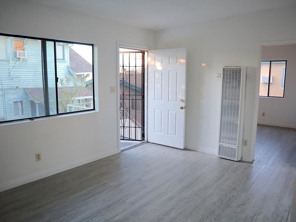 Cozy, BRIGHT, quiet and freshly painted upstairs unit in a rear duplex away from the street with a shared yard and two parking spots! Owner pays water, sewer, and gardener.